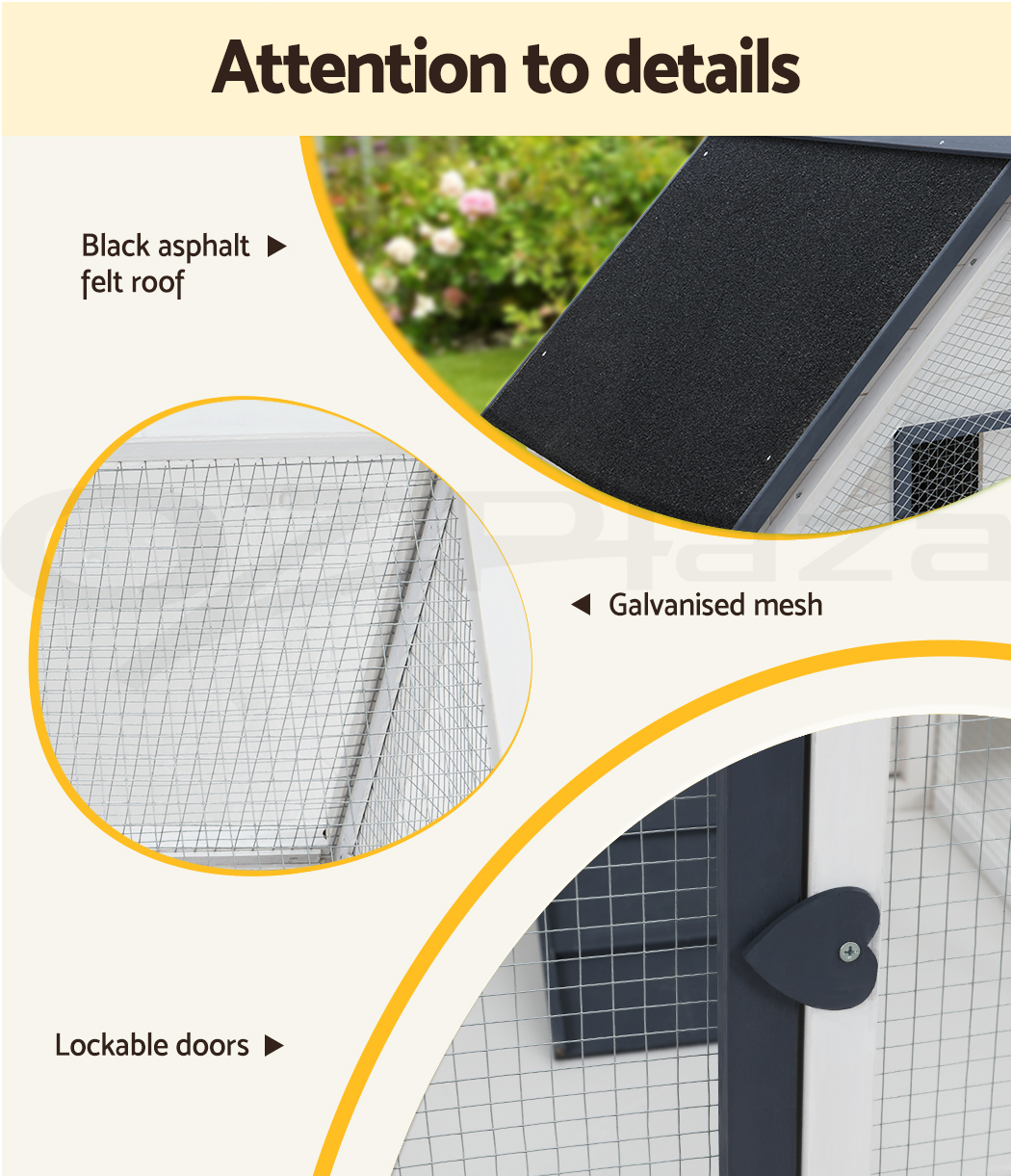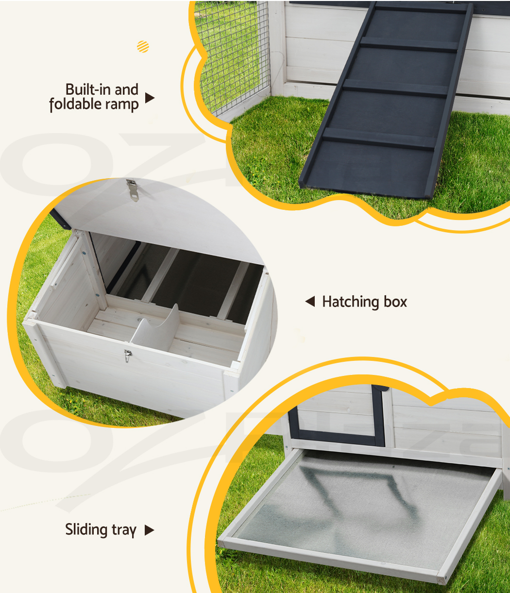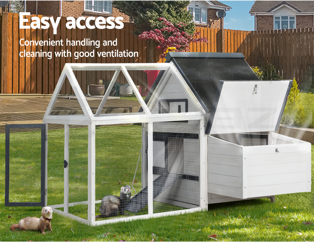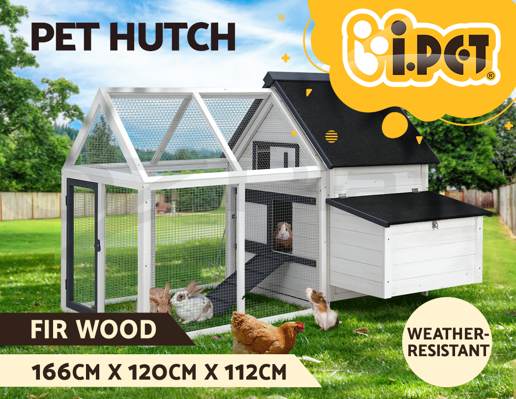 Give your beloved pets a safe and comfortable home to sleep, rest, play, and relax. The i.Pet's pet hutch makes a cosy home for your dear pets they will love and cherish forever. This pet hutch is suitable for smaller pets such as rabbits, chickens, hens, guinea pigs, hamsters, chinchillas and ferrets. Our pet hutch features a solid fir wood construction with galvanised mesh that ensures its sturdiness and durability for many years. It has a stable and firm base that's crucial for stability. Our pet hutch has black asphalt felt roof that provides good protection from sun and rain, keeping them cool in summer and warm in winter. It has a spacious integrated ground enclosed play area that allows your pets to have a great playtime outdoors. And the built-in foldable ramp that connects the ground area and hutch enables convenient entry and exit. Furthermore, the pet hutch also comes with a hatching box for egg collection and a slide-out tray for easy cleaning, and the front entrance door with sturdy security locks makes it even more convenient and reliable. The enclosed play area has a mesh structure, which keeps your pets comfortable and well-ventilated. This pet hutch will give your beloved pets the utmost joy and pleasure. Gift this pet hutch to your pets today, and be sure to get much love in return.