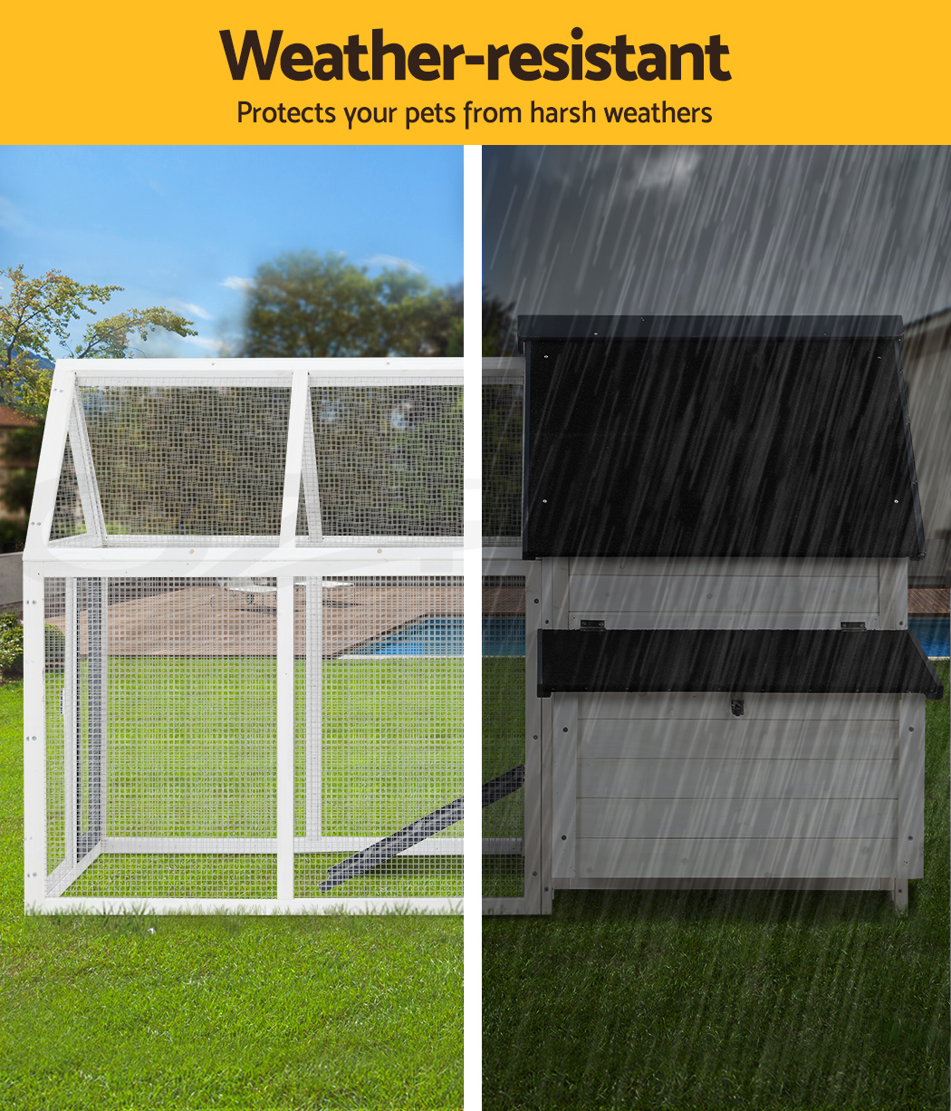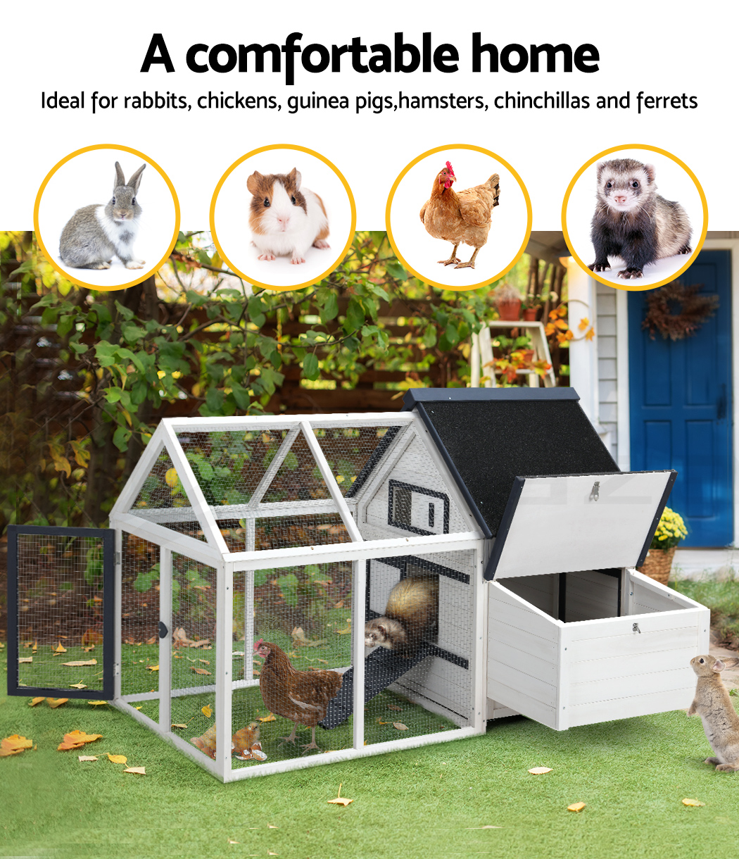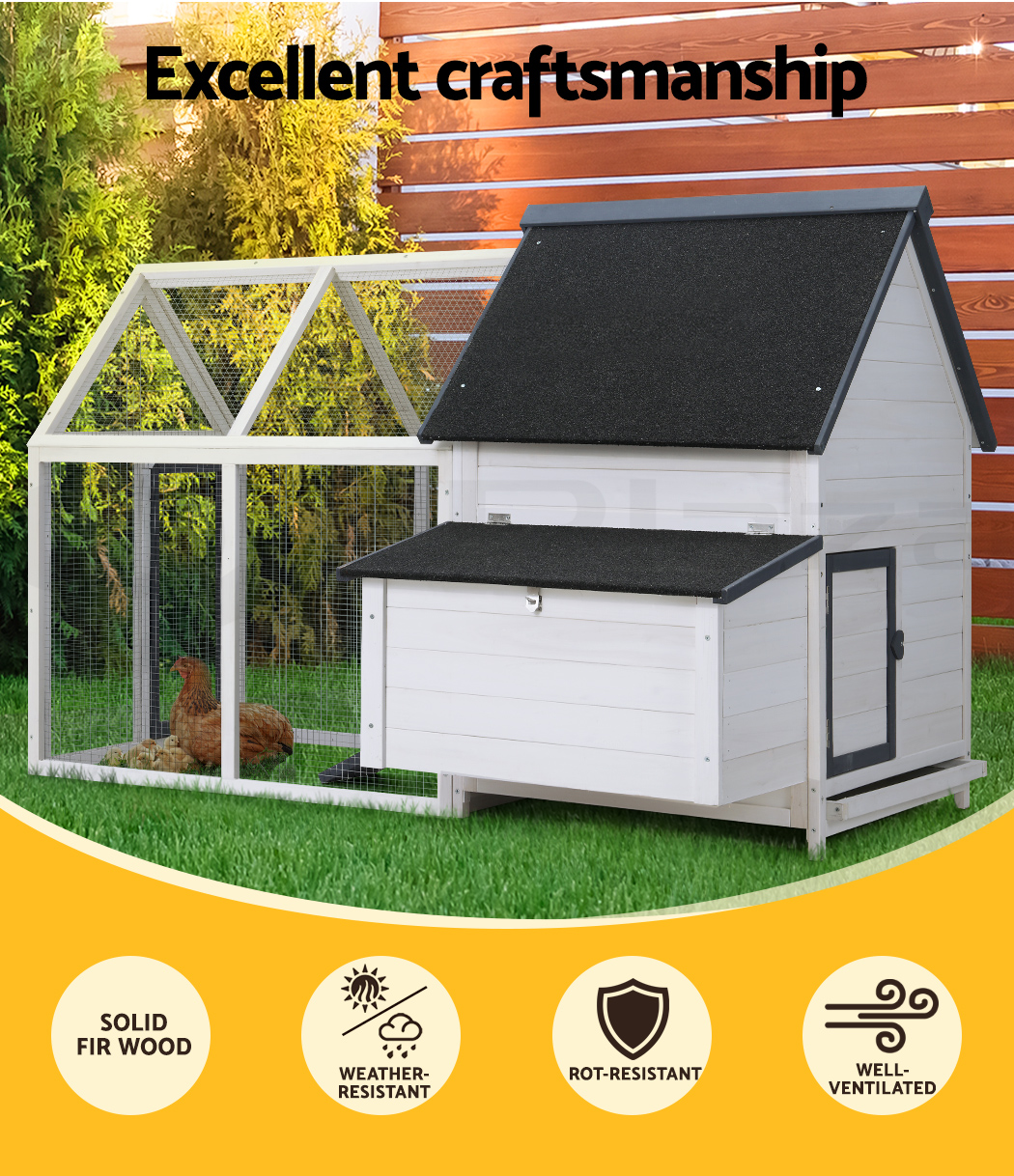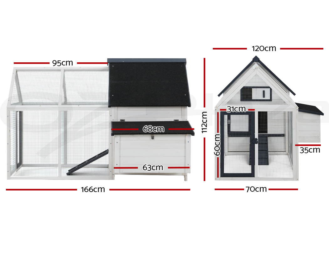 Give your beloved pets a safe and comfortable home to sleep, rest, play, and relax. The i.Pet's pet hutch makes a cosy home for your dear pets they will love and cherish forever. This pet hutch is suitable for smaller pets such as rabbits, chickens, hens, guinea pigs, hamsters, chinchillas and ferrets. Our pet hutch features a solid fir wood construction with galvanised mesh that ensures its sturdiness and durability for many years. It has a stable and firm base that's crucial for stability. Our pet hutch has black asphalt felt roof that provides good protection from sun and rain, keeping them cool in summer and warm in winter. It has a spacious integrated ground enclosed play area that allows your pets to have a great playtime outdoors. And the built-in foldable ramp that connects the ground area and hutch enables convenient entry and exit. Furthermore, the pet hutch also comes with a hatching box for egg collection and a slide-out tray for easy cleaning, and the front entrance door with sturdy security locks makes it even more convenient and reliable. The enclosed play area has a mesh structure, which keeps your pets comfortable and well-ventilated. This pet hutch will give your beloved pets the utmost joy and pleasure. Gift this pet hutch to your pets today, and be sure to get much love in return.